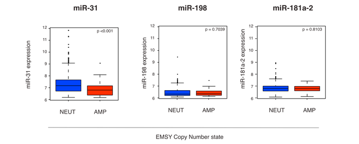 Amplification of the EMSY gene in sporadic breast and ovarian cancers is a poor prognostic indicator. Although EMSY has been linked to transcriptional silencing, its mechanism of action is unknown. Here, we report that EMSY acts as an oncogene, causing the transformation of cells in vitro and potentiating tumor formation and metastatic features in vivo. We identify an inverse correlation between EMSY amplification and miR-31 expression, an antimetastatic microRNA, in the METABRIC cohort of human breast samples. Re-expression of miR-31 profoundly reduced cell migration, invasion, and colony-formation abilities of cells overexpressing EMSY or haboring EMSY amplification. We show that EMSY is recruited to the miR-31 promoter by the DNA binding factor ETS-1, and it represses miR-31 transcription by delivering the H3K4me3 demethylase JARID1b/PLU-1/KDM5B. Altogether, these results suggest a pathway underlying the role of EMSY in breast cancer and uncover potential diagnostic and therapeutic targets in sporadic breast cancer.